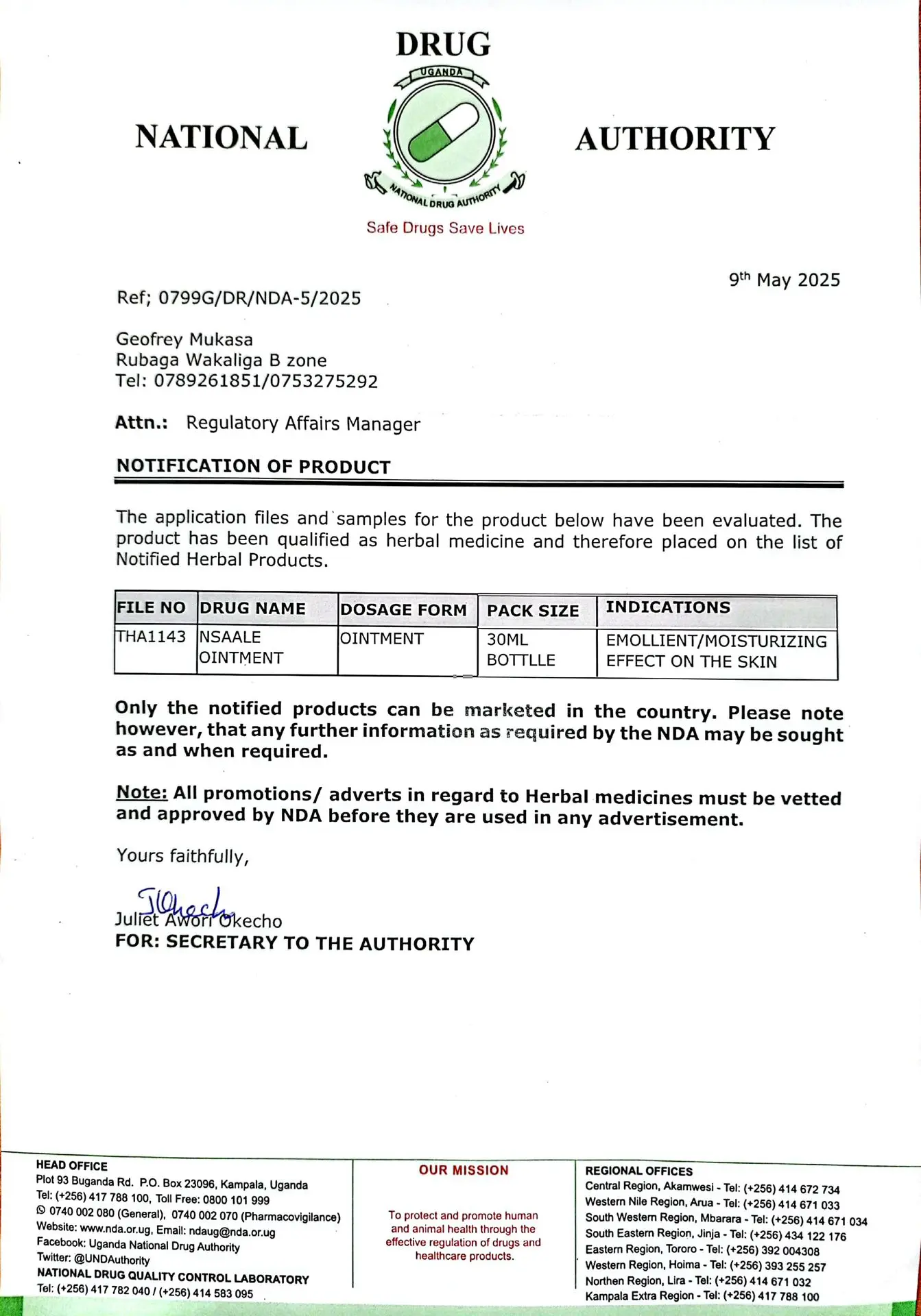 NDA Reg. No. THA1143 was notified and registered on National Drug Register for Emollient/Moisturizing effect on the Skin on 9th May 2025.